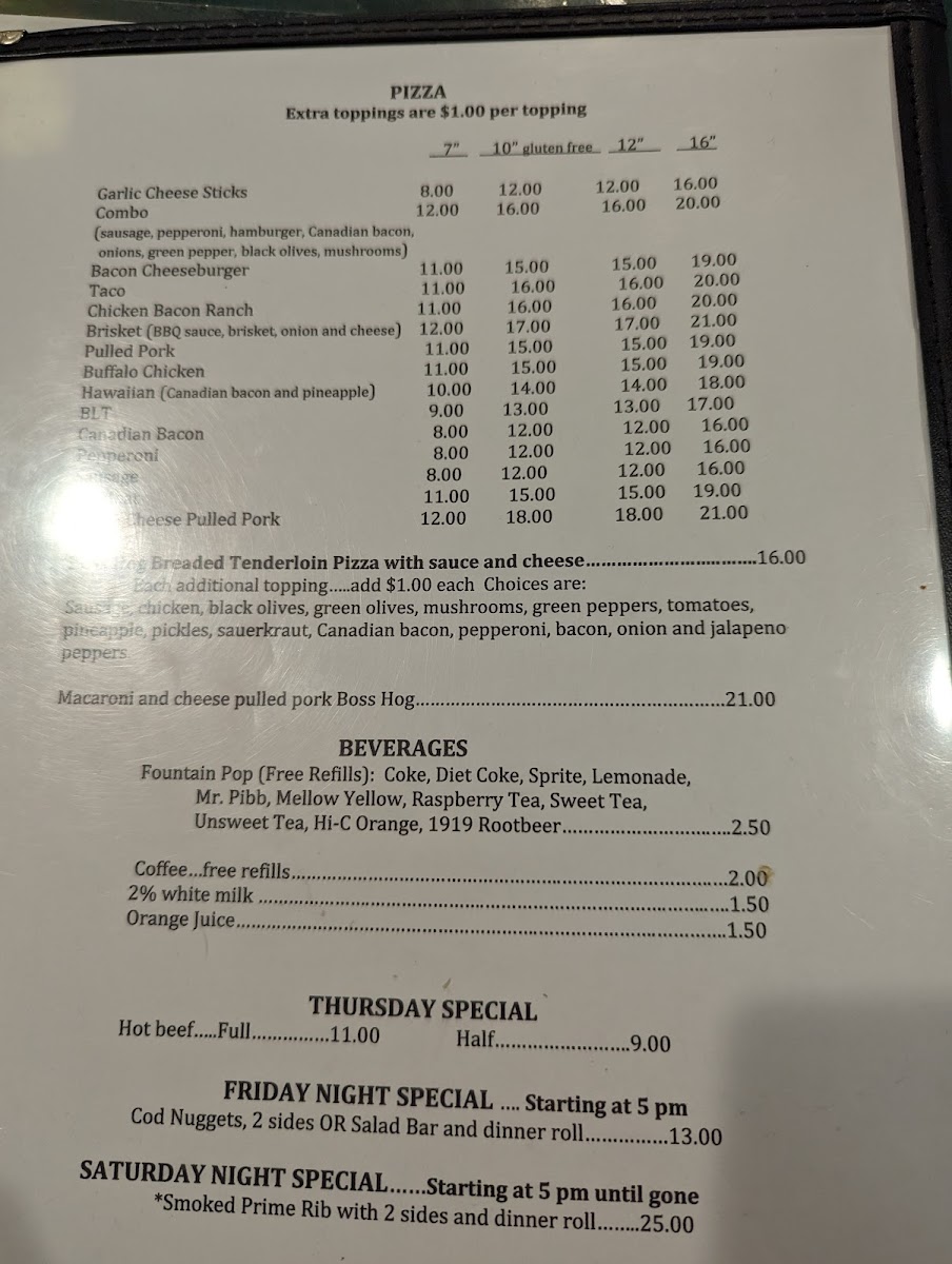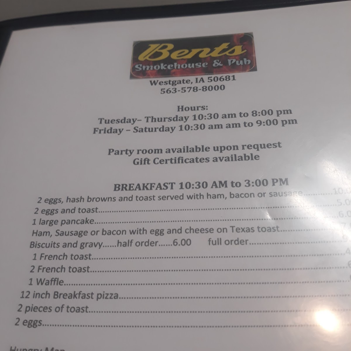 Welcome to Bents Smokehouse & Pub, a haven for barbecue enthusiasts located at 100 Main St, Westgate, IA. This restaurant offers a mouthwatering menu that beautifully marries traditional comfort food with smoky delights. Start your day with breakfast classics like the hearty 2 Eggs with Hash Browns or indulge in a delectable 12 Inch Breakfast Pizza.